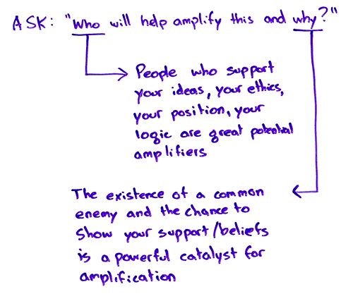 One of the great things about framing things in terms of who are my allies, the people on my side, and who are the enemies I'm going to create is that the "who" becomes much more clear. The people who support your ideas, your ethics, or your position, your logic, your data and want to help amplify that, those are people who are potential amplifiers. The people, the detractors, the enemies that you're going to build help you often to identify that group.