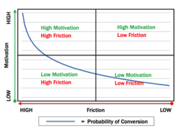 On the Friction vs Motivation graphic, the Probability of Conversion line should be highest in the high motivation/low friction quadrant and lowest in the low motivation/high friction quadrant. So the line should run from the lower left to the upper right.