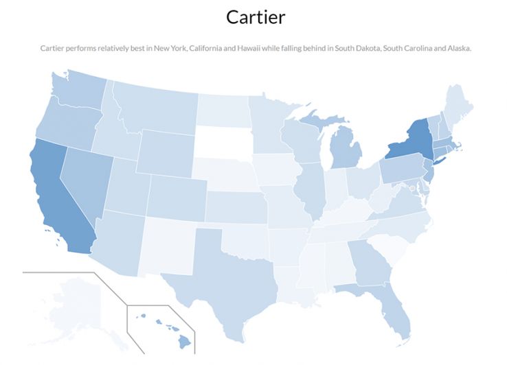 So maybe you aren't OK Cupid with millions of users and you can't find unique data to share — don't worry, there's still hope. The example below is a rather ingenious method of using Google Adwords data to build a geographical story that's relatable to any potential customer in the United States. The webmasters at Opulent used state-level Keyword Planner to visualize popularity across the country in a piece they call the "State of Style."