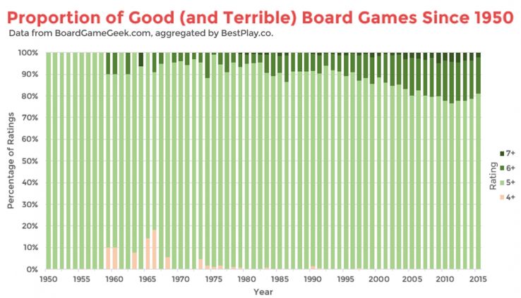 So how would this work with content for your own site? Let's look at an example from BestPlay.co, which wrote a piece on Board Games are Getting Worse. Board games aren't a data-centric industry, but that doesn't keep them from producing awesome content with data. Here's a generic graph they provide in the piece which shows off average board game ratings.