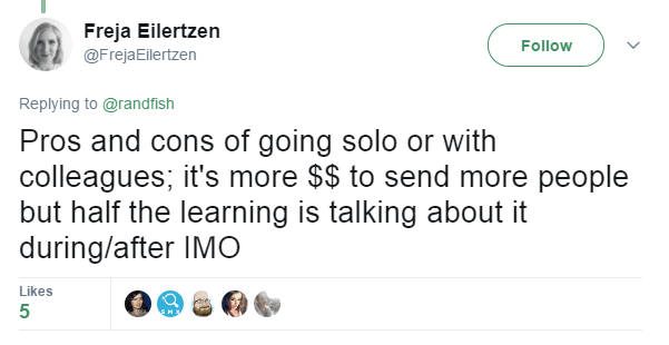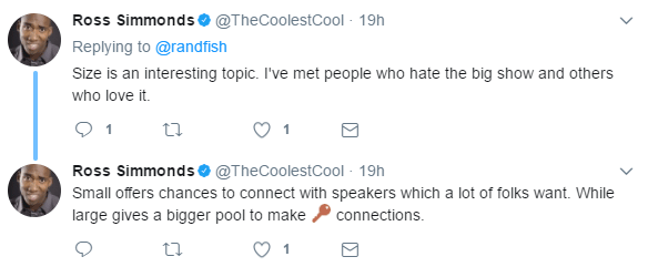 There were a number of these conflicting points-of-view in reply to my tweet, and I think they indicate the challenge for attendees and organizers. Opinions vary about what makes for a great conference, a great speaker or session, or the best way to get value from them.