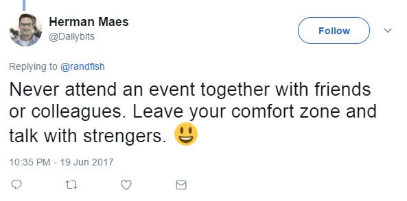 Yep I learn way more in the networking than on the day, often a quick pint with one of the speakers, I tried that and this, because speakers often only get 30m and have to slice the info ... often the best talks are inspiring rather than informative...