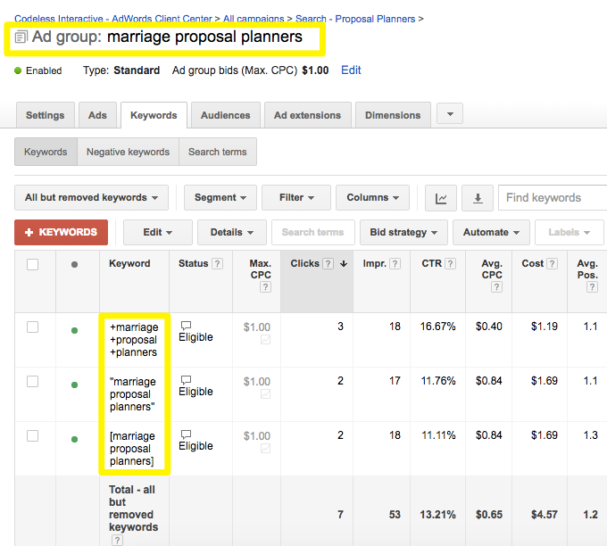 After reading this page and noticing you mentioned your client had an improvement where now they have a 12.76 conversion rate, I realized our conversion rate is already much higher than that. Maybe I should leave my campaign alone, just yesterday our conversion ratio was 47% and we received 97 leads. So do I want to mess with that? Also, I am very hesitant with trying your recommendation above where you use the same keyword but in broad match modifier, phrase and exact match -- you will be competing against yourself for many of the same keywords and costs would go up right? I always start with broad match modifier, and then eventually taking the gold inside the search terms report generated from that, and making those hot phrases into phrase match gradually optimizing and tightening up each Ad group. Also, what worked great for me was having my developer created a custom landing page inside WP. So when I want to make a new ad group, the template is always available in Wordpress so that within minutes I can make amazing Adwords landing pages. I simply add a new page inside WP, go into the page editor and just change factors like the h1, title, url, and some of the content to align the landing page with my keywords as you are saying to do. It makes such a big improvement to conversion ratio and lowers the cost for leads when you separate a big campaign and turn it into smaller ad groups all tightly grouped. I personally feel that 8-15 keywords per ad group is the magic number. If we only add one keyword in all 3 match types, I am just a bit confused with how that will benefit.