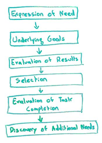 When I do that, when I perform my search, I have this sort of evaluation of results. Is this going to help me do what I want? Then I choose one, and then I figure out whether that result actually helps me complete my task. If it does, I might have discovery of additional needs around that, like once you've answered my disinfect a cut, now it's, okay, now I kind of want to know how to prevent an infection, because you described using disinfectant and then you said infections are real scary. So let me go look up how do I prevent that from happening. So there's that discovery of additional needs. Or you decide, hey, this did not help me complete my task. I'm going to go back to evaluation of results, or I'm going to go back to my expression of need in the form of a different search query.