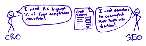 There's a challenge. I want to be totally up front that there is a real challenge and a problem between this world of optimizing for searcher task accomplishment and the classic world of we want our conversions. So the CRO in your organization, which might be your director of marketing or it might be your CEO, or maybe if your team is big enough, you might have a CRO specialist, conversation rate optimization specialist, on hand. They're thinking, "Hey, I need the highest percent of form completions possible."