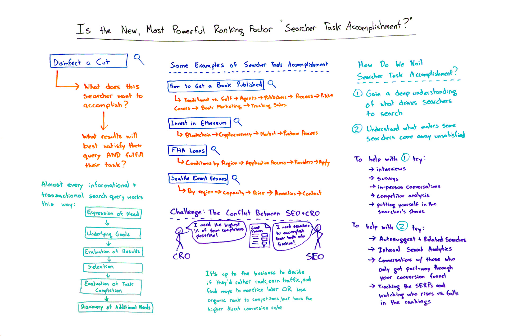 Move over, links, content, and RankBrain — there's a new ranking factor in town, and it's a doozy. All kidding aside, the idea of searcher task accomplishment is a compelling argument for how we should be optimizing our sites. Are they actually solving the problems searchers seek answers for? In today's Whiteboard Friday, Rand explains how searcher task accomplishment is what Google ultimately looks for, and how you can keep up.